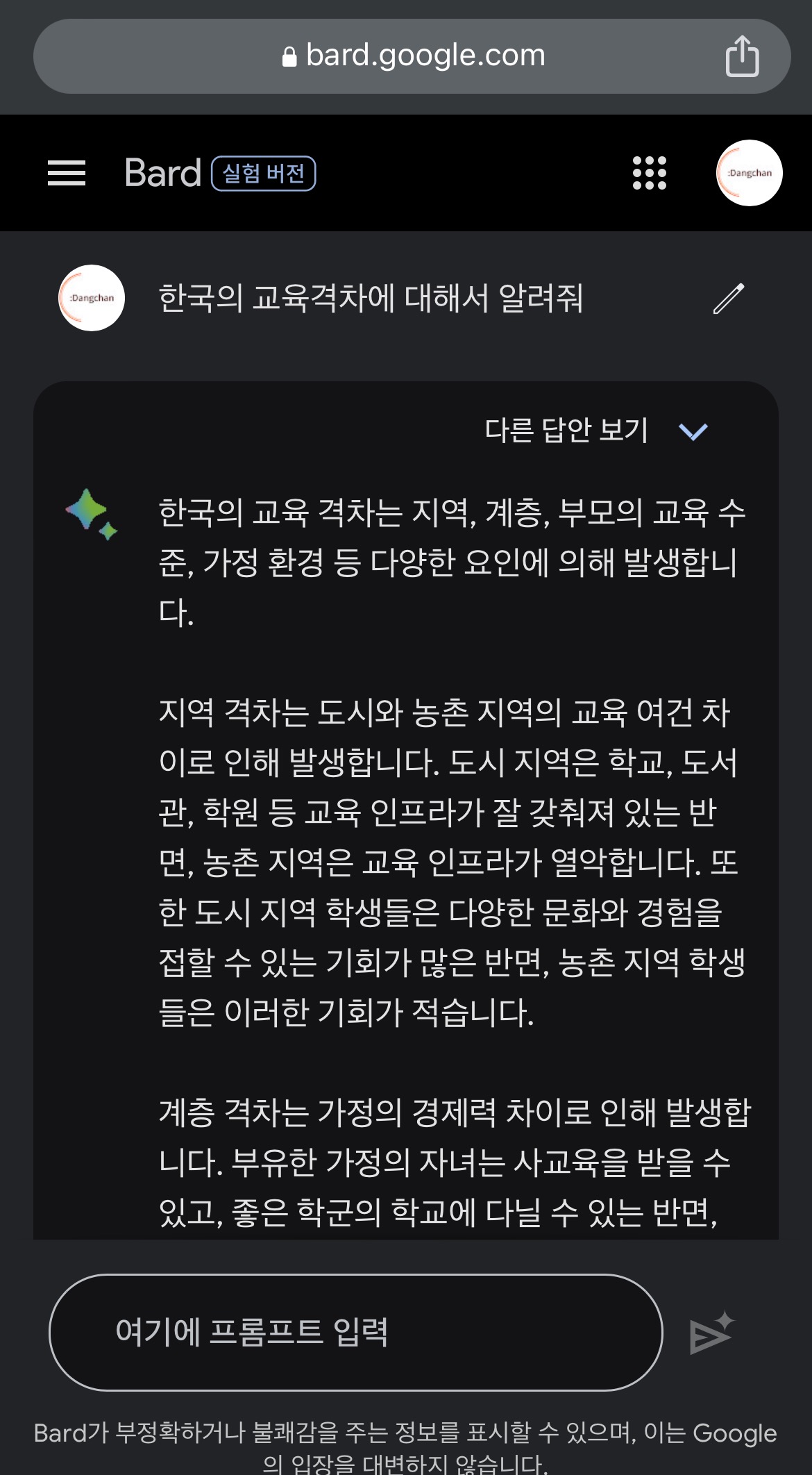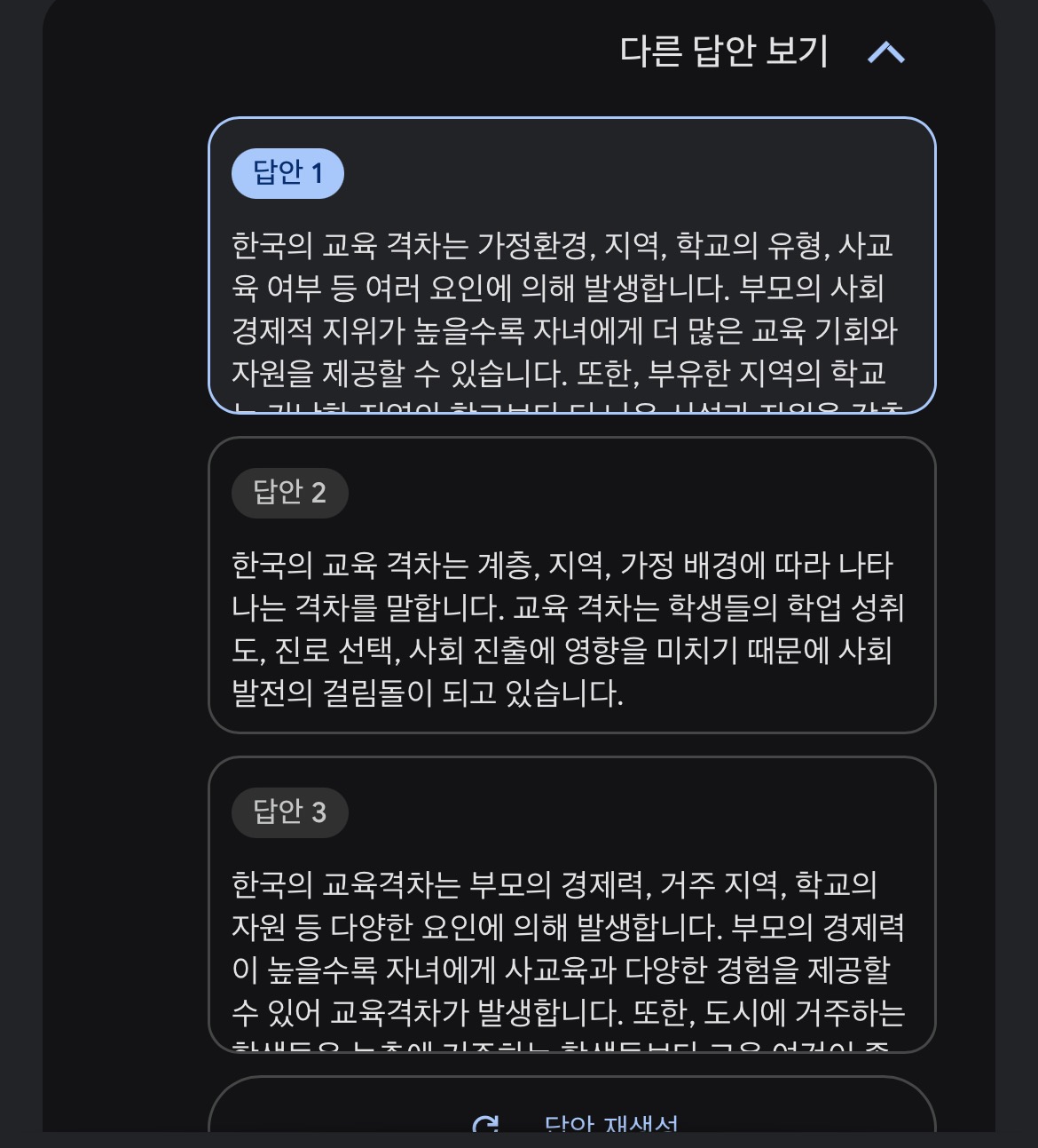 바드에게 무엇을 물어볼까 고민하다가 한국의 교육격차를 검색해 보았습니다.