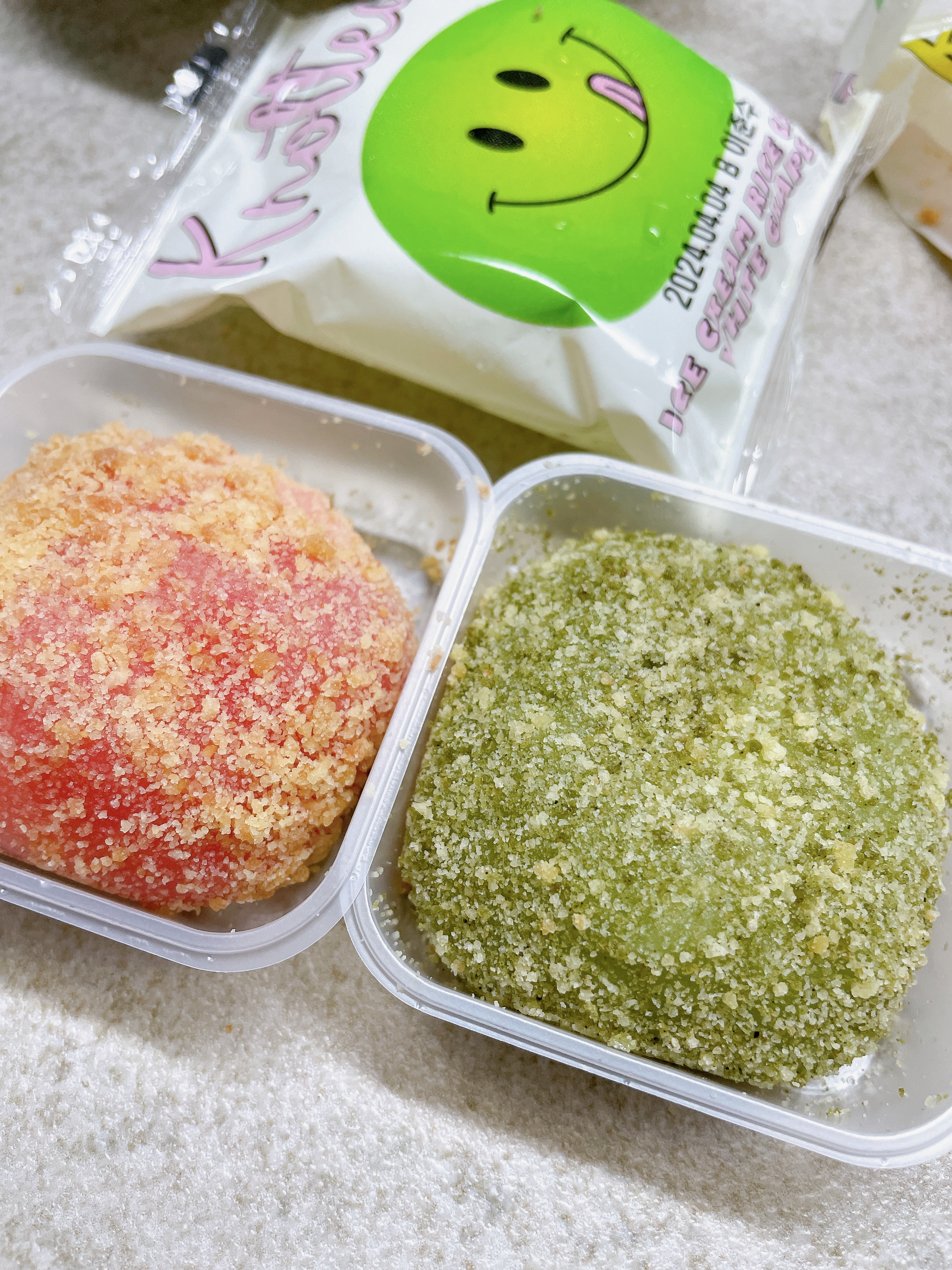 홈플러스에서 판매되고 있는 노티드 크림떡은 총 2종으로 딸기 / 청포도이다. 겉은 보드라운 카스테라 가루가 뿌려져있고, 쫀득쫀득한 찰떡 안에 딸기크림, 청포도 크림이 들어있다.