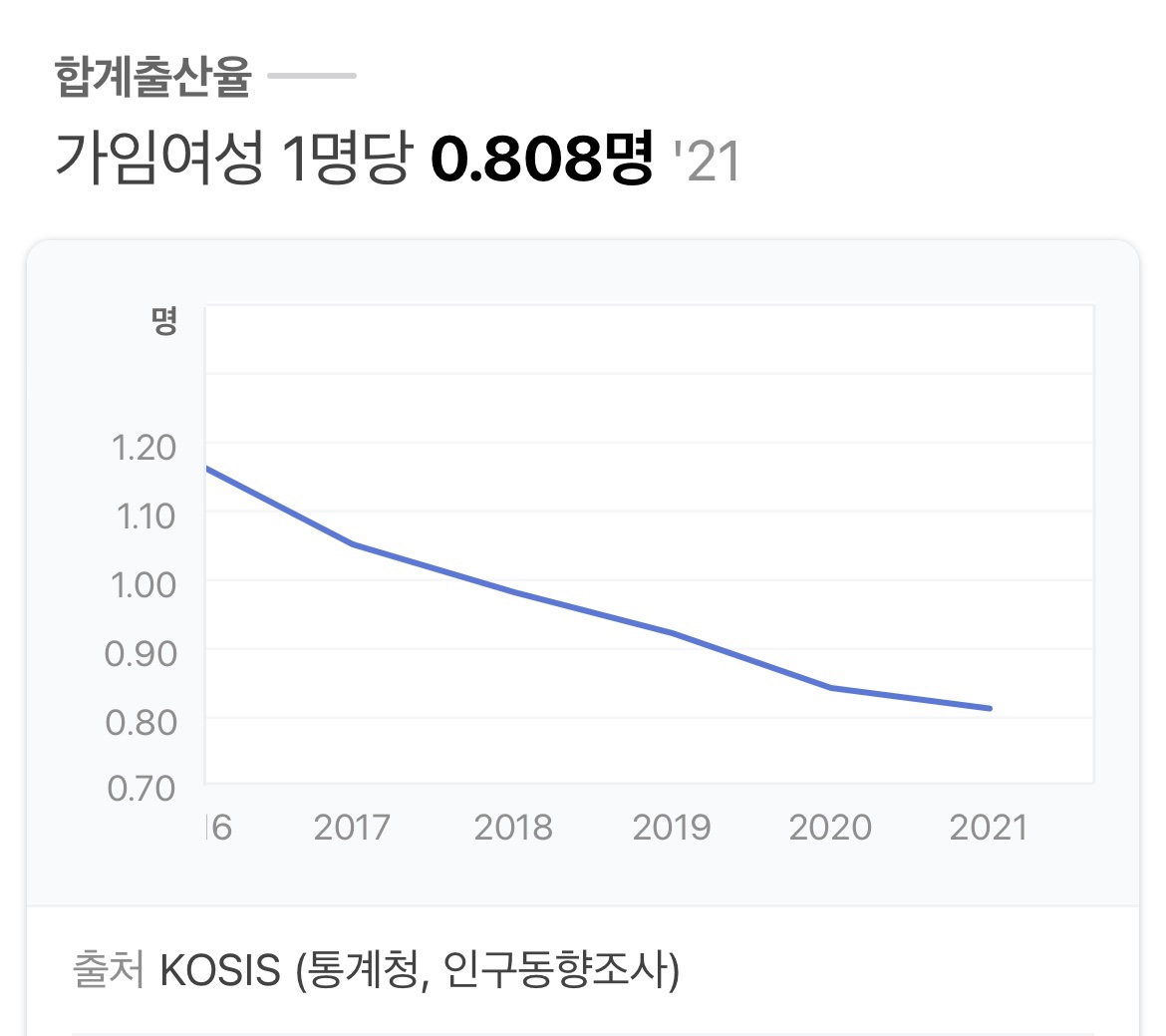 한 여성이 가임기간에 낳을 것으로 예상되는 평균 출생아 수를 말한다.이처럼 출산율이 가파르게 절벽으로 떨어지고 있다.