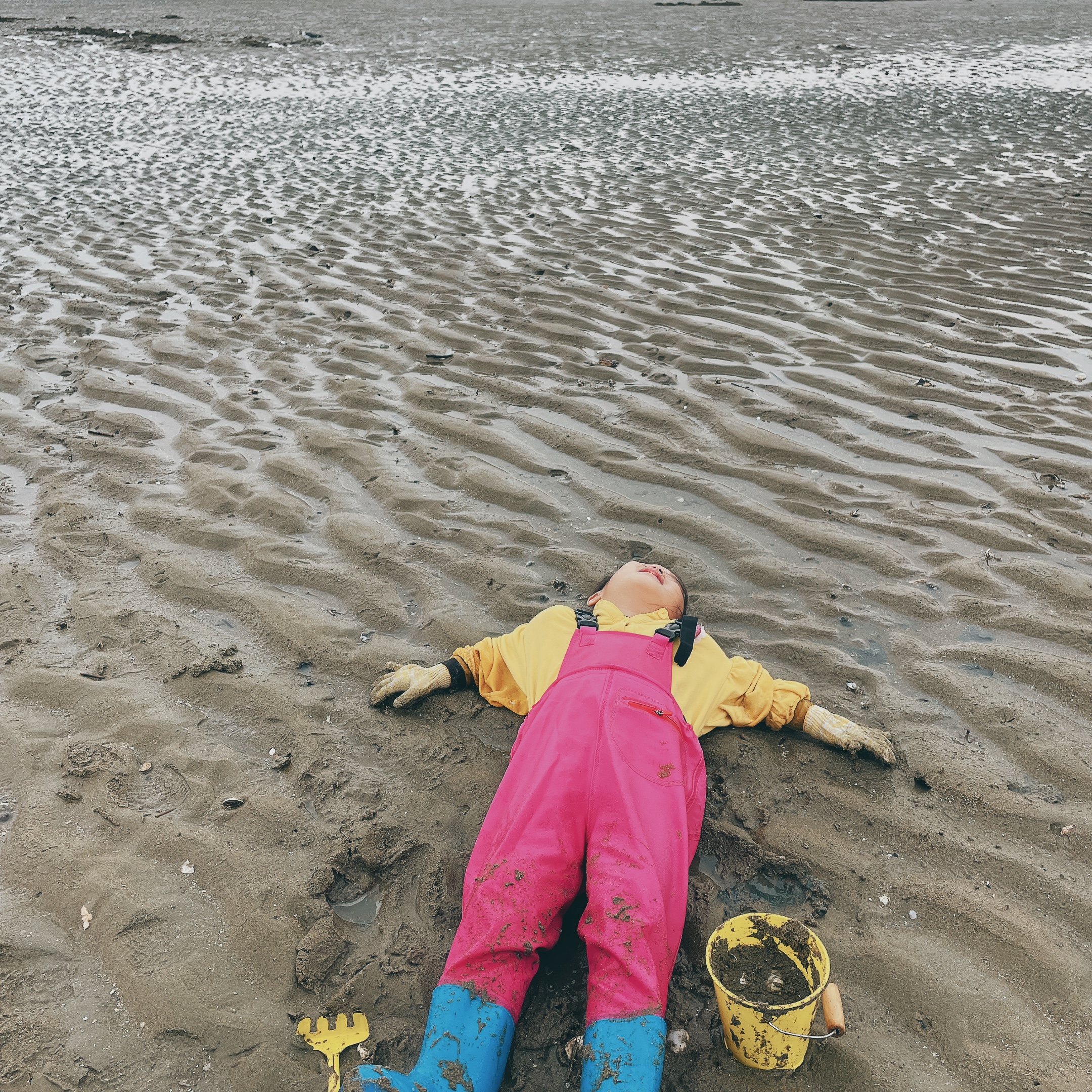 아이는 갯벌을 침대삼아 누워보고 뒹굴고 자연을 몸소 느꼈습니다. 가슴장화 안에 미술가운, 전신수트를 입히시는 걸 추천합니다.