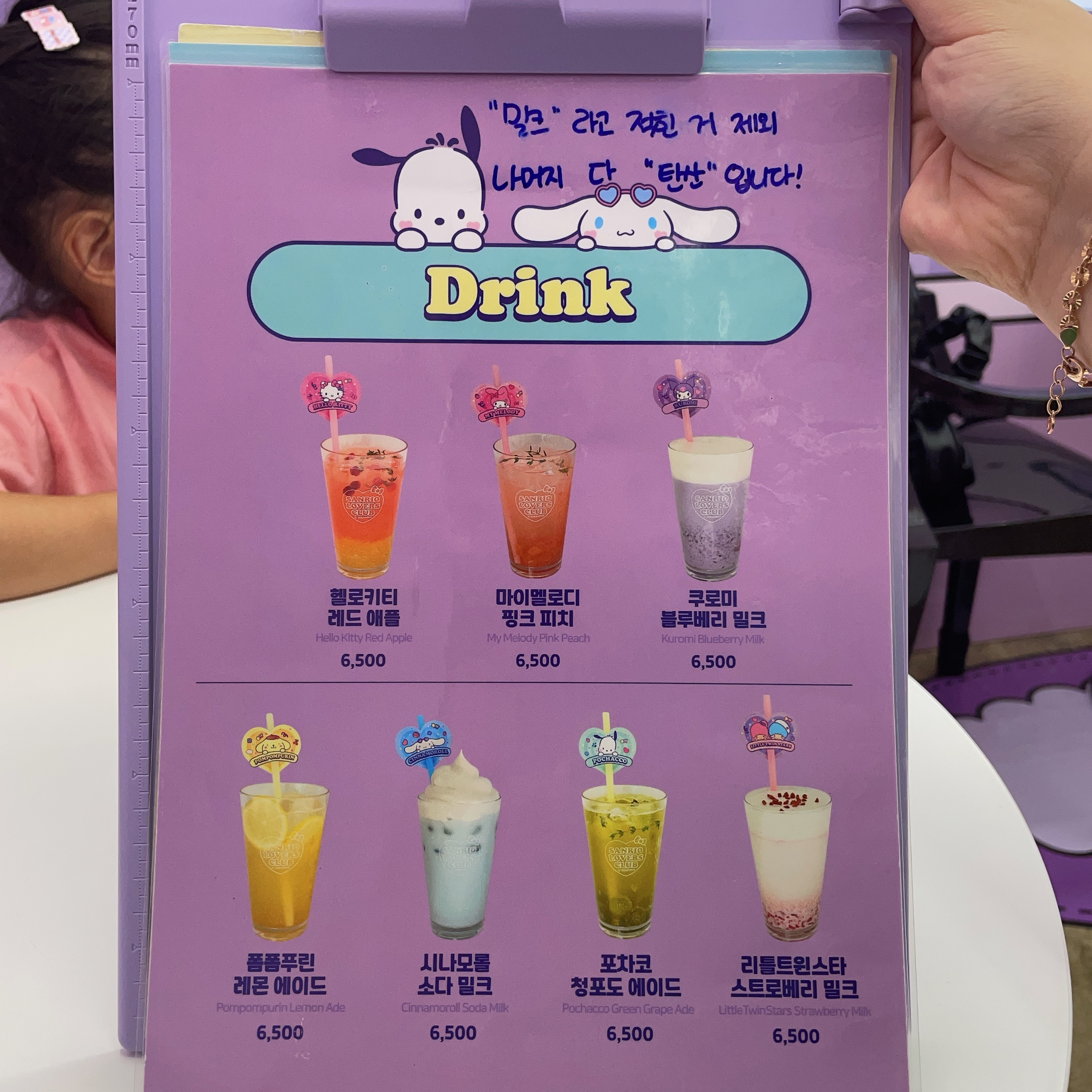 헬로키티 레드 애플 / 마이멜로디 핑크 피치 / 쿠로미 블루베리 밀크 / 폼폼푸린 레몬 에이드 / 시니모롤 소다 밀크 / 포차코 청포도 에이드 / 리틀트윈스타 스트로베리 밀크