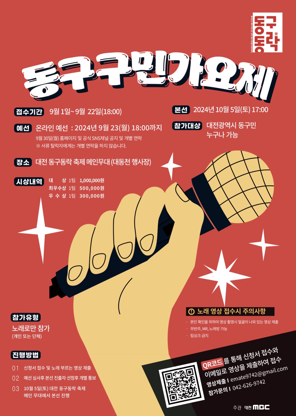 1. 포스터 QR코드를 통해 신청서 접수 - https://m.site.naver.com/1qirJ (동구 구민 가요제 접수)