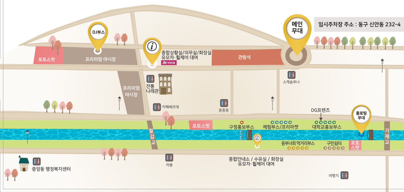 - 대동천 : 버스킹 부스, 체험부스 , 프리마켓 / 편의시설, 지역 먹거리존, 야간조명